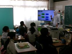 4年生は給食の時間にお米の加工品や食料自給率について学びました。給食を食べながら栄養士の話に耳を傾けていました。