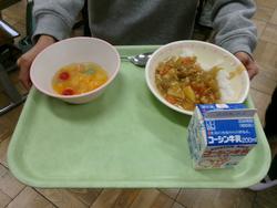 ●写真1枚目・2枚目・3枚目…配膳された給食は、手作りカレーとフルーツポンチ。
