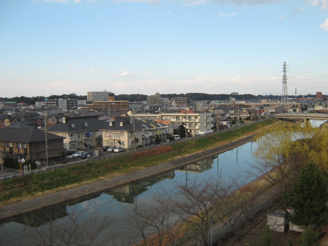 近くには,県立小金高等学校,団地の向こう側に新松戸駅があります。